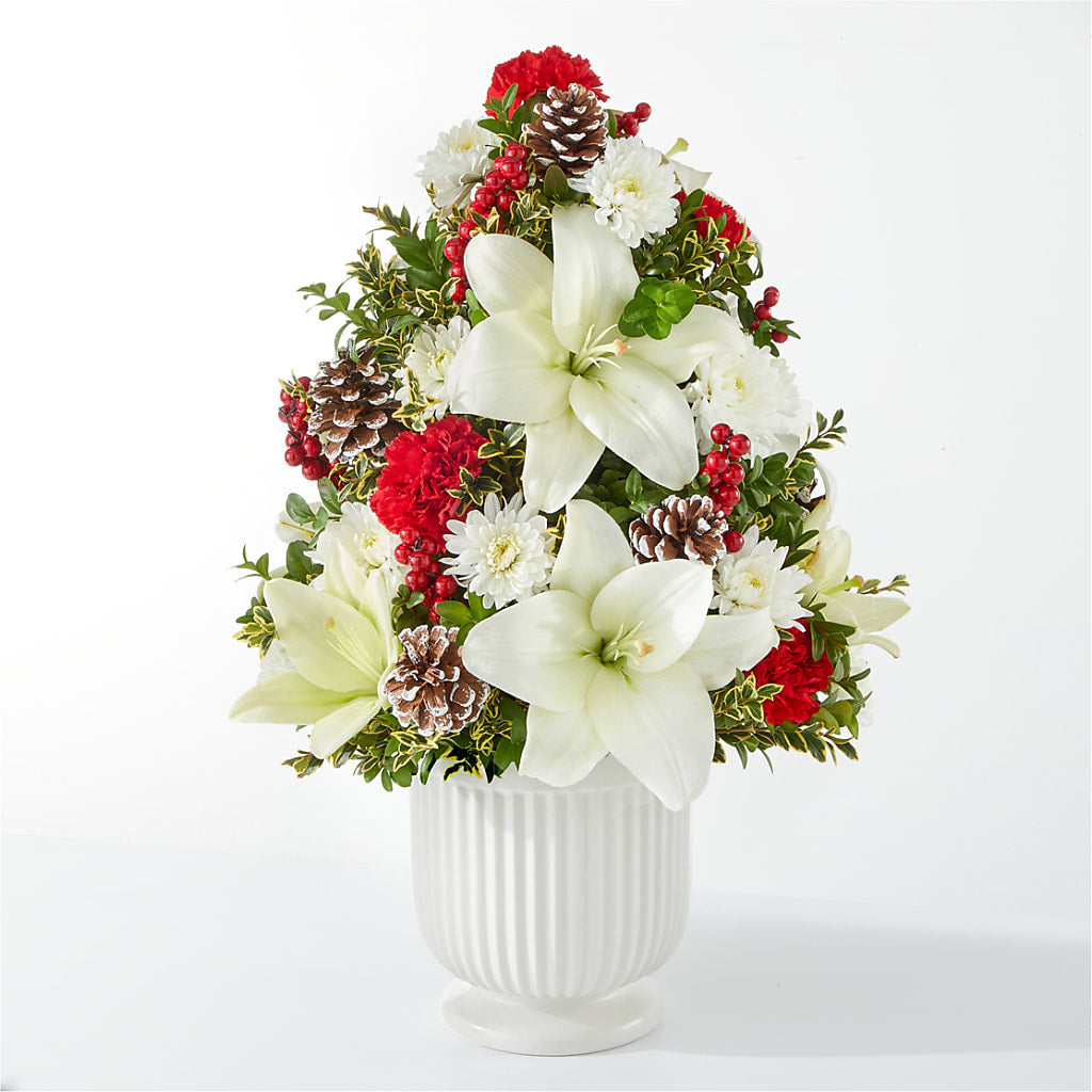 An elegant arrangement of white lilies accented by red carnations, assembled by your local florist in the shape of a mini tree.